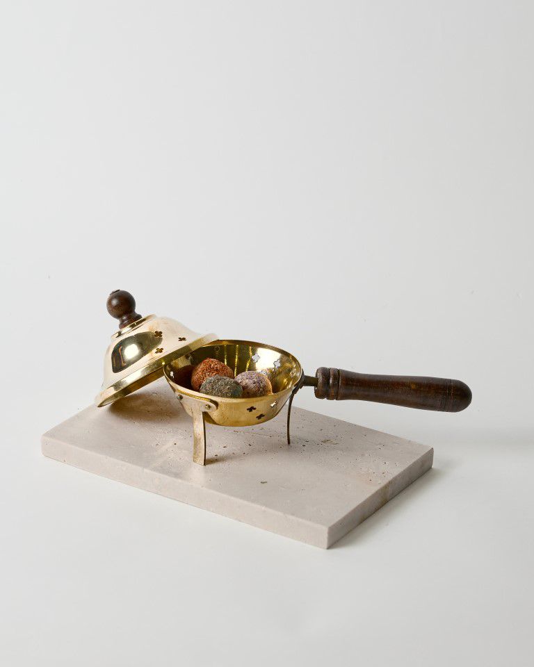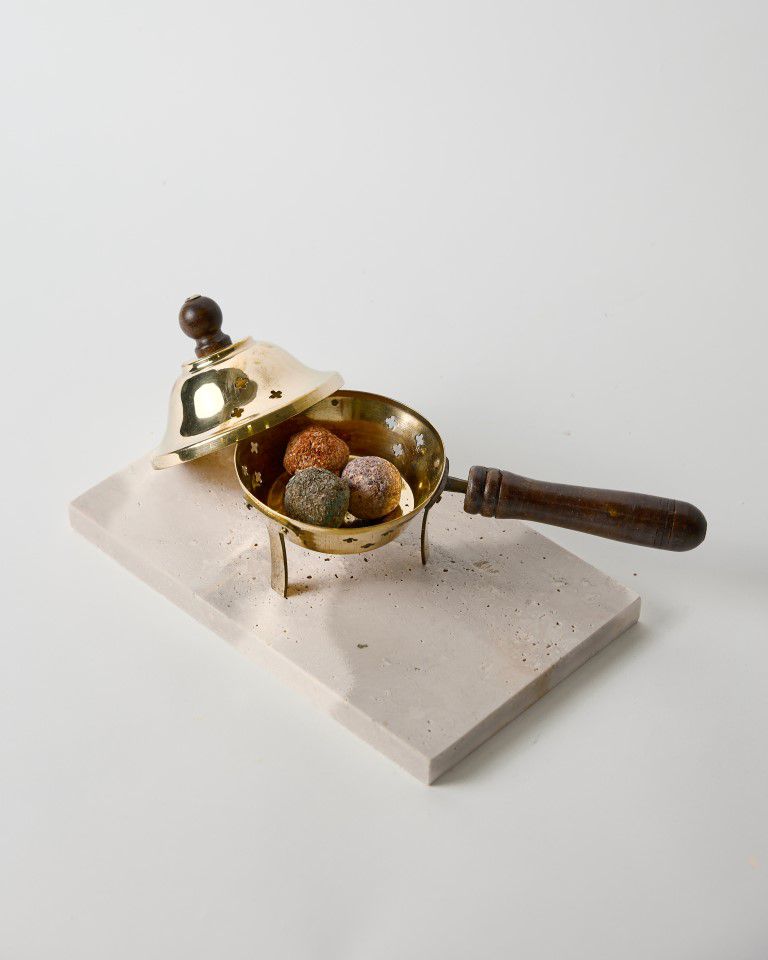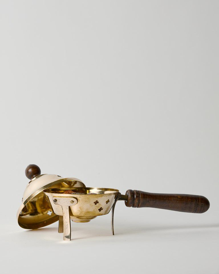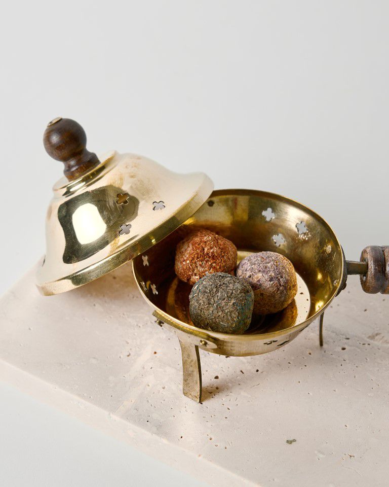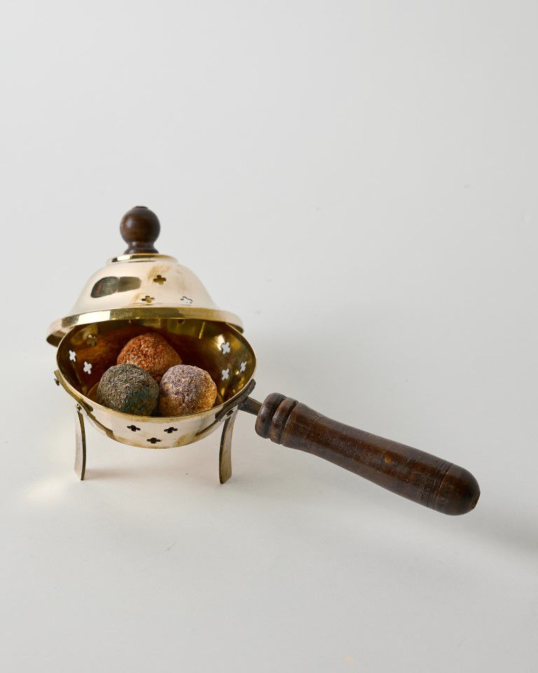 כלי מעוצב מנחושת להקטרה של שרפים ועלים , עמיד לחום, עם מכסה וידית עץ,