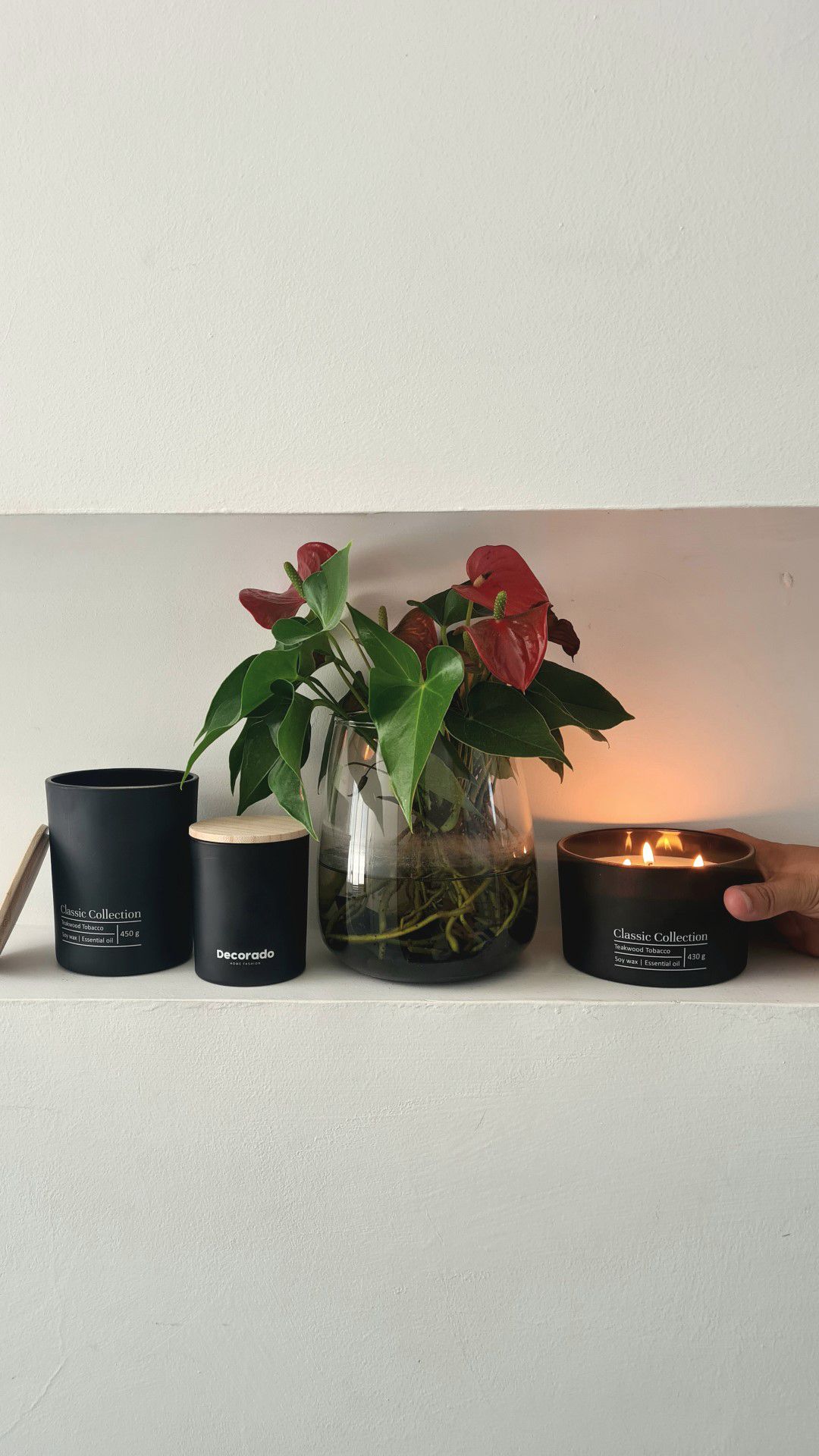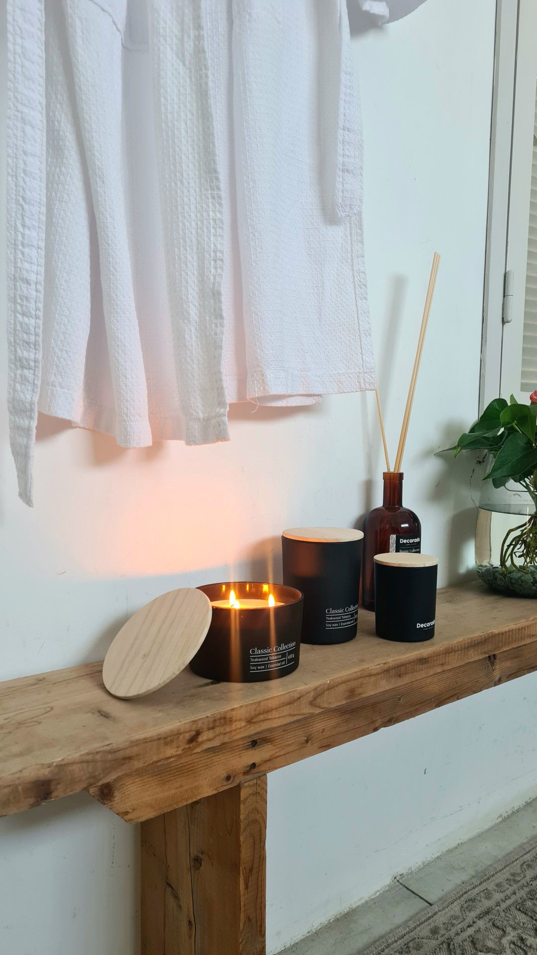 נר סויה בניחוח עצי וצמחי טרופי עשיר, משלב תווים של מאסק, סנדלווד ועץ הטיק